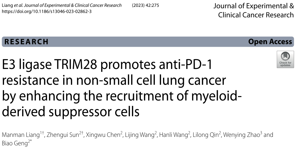 近日,來自皖南醫(yī)學(xué)院的研究者們在J Exp Clin Cancer Res.雜志上發(fā)表了題為“E3 ligase TRIM28 promotes anti-PD-1 resistance in non-small cell lung cancer by enhancing the recruitment of myeloid-derived suppressor cells” 的文章,該研究表明TRIM28通過ripk1介導(dǎo)的NF-κB激活,作為趨化因子驅(qū)動的MDSCs募集的啟動子,導(dǎo)致浸潤性活化CD8+T細(xì)胞受到抑制,并產(chǎn)生抗pd -1耐藥性。