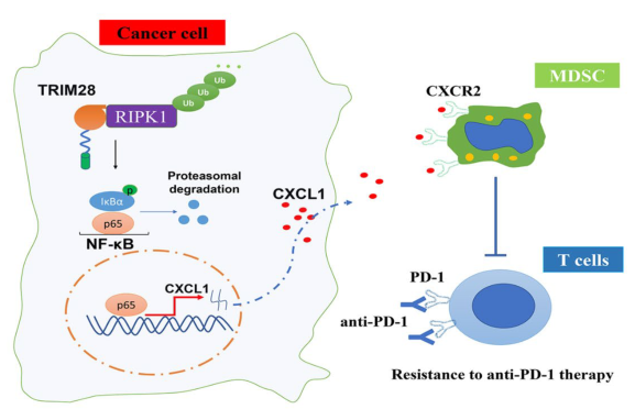 研究結(jié)果顯示TRIM28的表達(dá)與NSCLC中抑制性髓源性抑制細(xì)胞(MDSCs)的浸潤呈正相關(guān)。此外,沉默TRIM28可通過重塑炎癥腫瘤微環(huán)境來增強(qiáng)抗pd -1免疫治療的療效。在機(jī)制上,研究者證明TRIM28可以物理地與受體相互作用蛋白激酶1 (RIPK1)相互作用,并促進(jìn)k63相關(guān)的RIPK1泛素化,這對于維持NF-κB通路的激活至關(guān)重要。E3連接酶結(jié)構(gòu)域的突變證實了E3連接酶活性在trim28介導(dǎo)的NF-κB激活中的重要作用。進(jìn)一步實驗發(fā)現(xiàn)TRIM28可通過激活NF-κB信號通路上調(diào)CXCL1的表達(dá)。CXCL1可與MDSCs上的CXCR2結(jié)合,促進(jìn)其向腫瘤微環(huán)境遷移。TRIM28敲除增加了免疫功能小鼠對抗pd -1治療的反應(yīng)性,其特征是CD8+T腫瘤浸潤淋巴細(xì)胞增加,MDSCs減少。